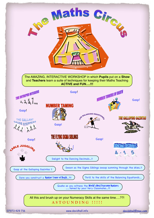 call David on 07973 429 716 or email him by clicking here ! Maths Circus - a dynamic, fun, inspiring and original way to learn and revise numeracy skills - and a superb resource for teachers !!