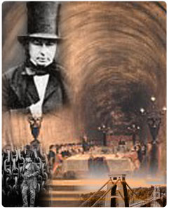 The (literally) groundbreaking Thames Tunnel at Rotherhithe, a project of his father Marc from whom Isambard took over at the age of only twenty. The technology by which this tunnel was made through the waterlogged and porous soils under the Thames was adopted as the new tunnelling technique for the world. There were five floodings and dozens of deaths, yet Brunel persevered and after eighteen years the first tunnel in the world under a metropolitan river was opened. It is still there and still in use to this day! When even the great miner and engineer Trevithick failed even to sink a shaft, how did he do it? Brunel will explain!