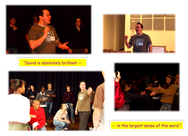 - A guest teaching appearance at Amanda Redmond's school in Ealing, in which David worked with great success with the whole school (ages five to twenty-five) mostly using exercises from the Physical Theatre approaches (see above).